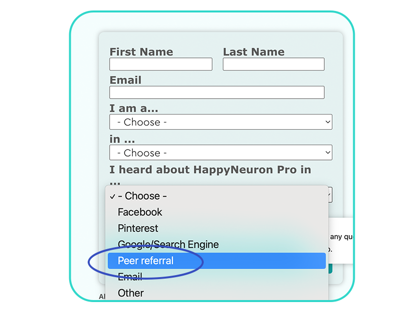 1. When the new subscriber fills out the form to sign up for a free trial with us, they’ll need to select “peer referral” from the dropdown menu.
